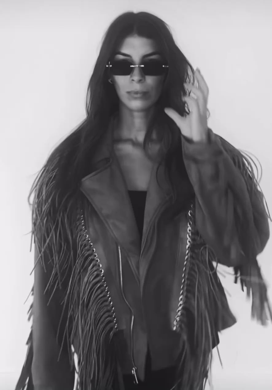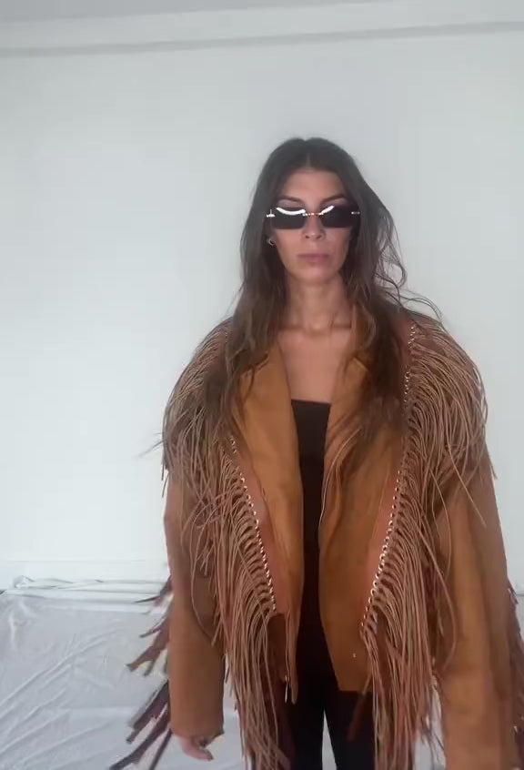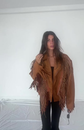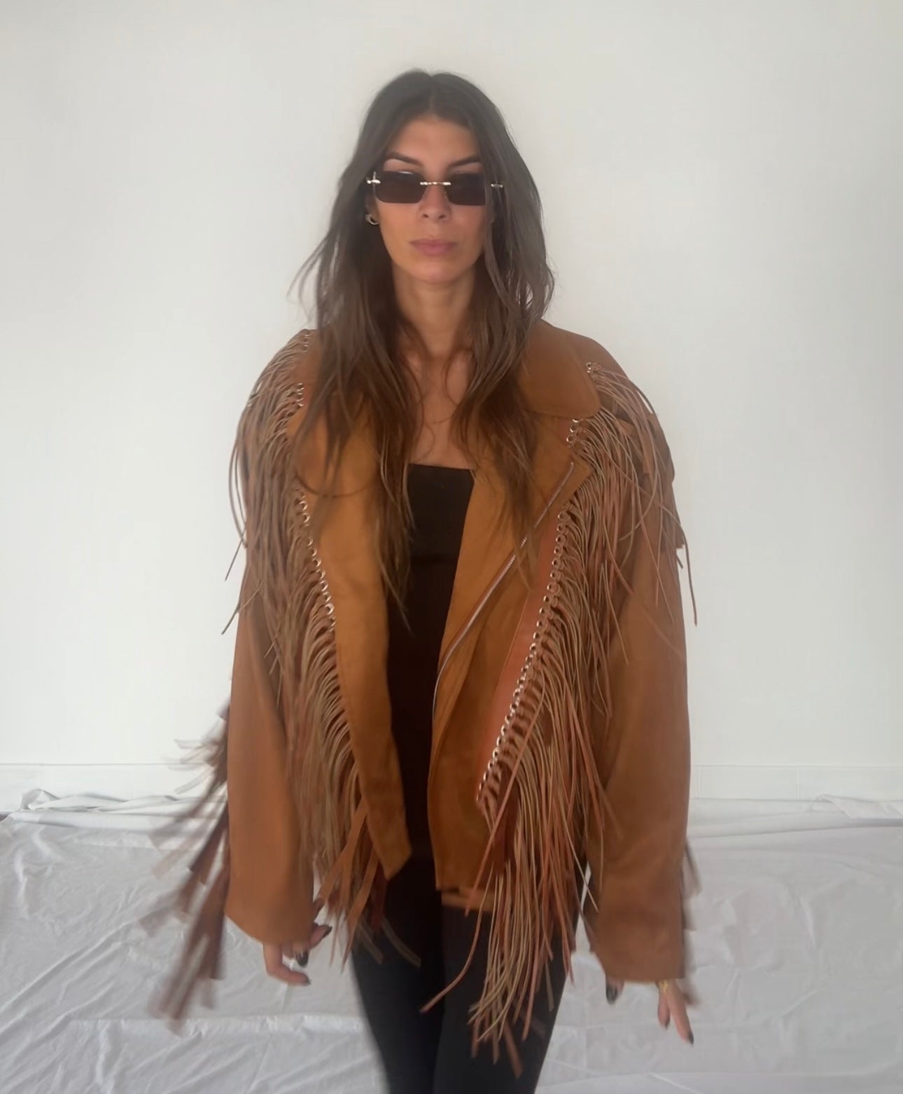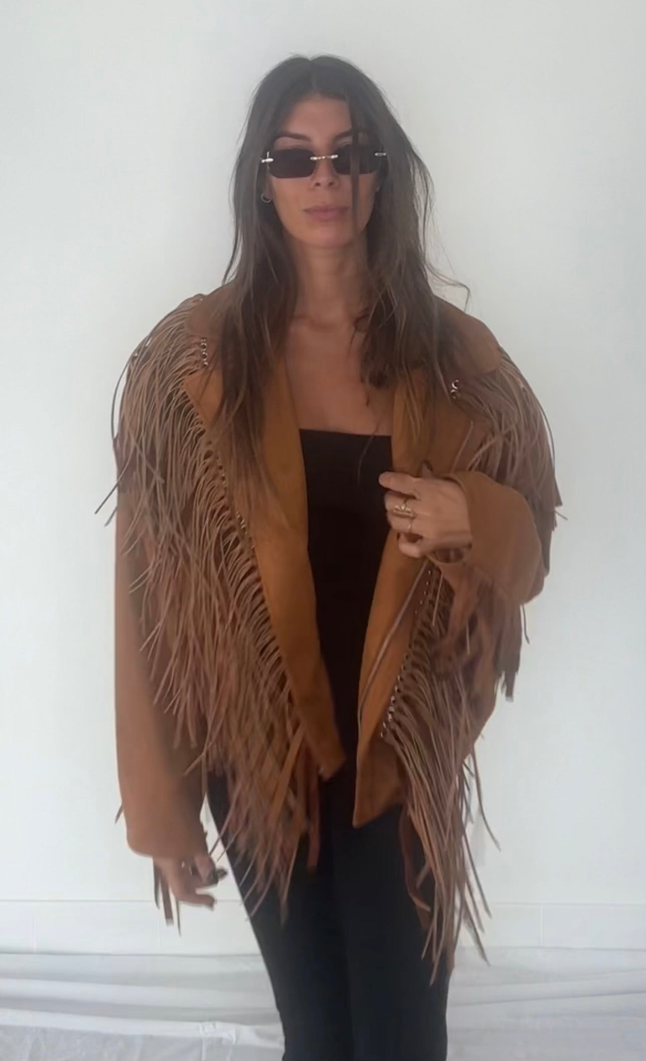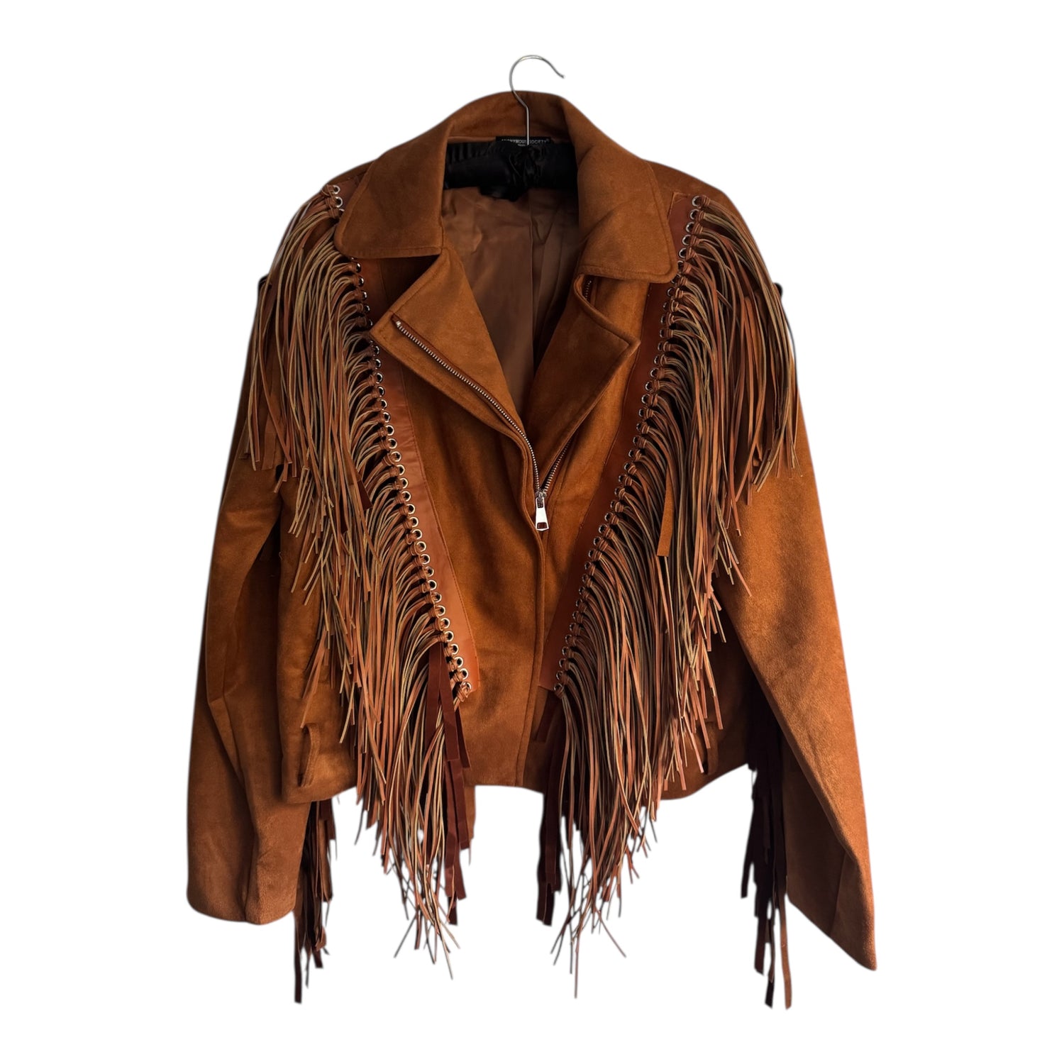 Biker franjas camurça camel , com aplicação de franjas em couro na frente com acabamento em ilhó prata .