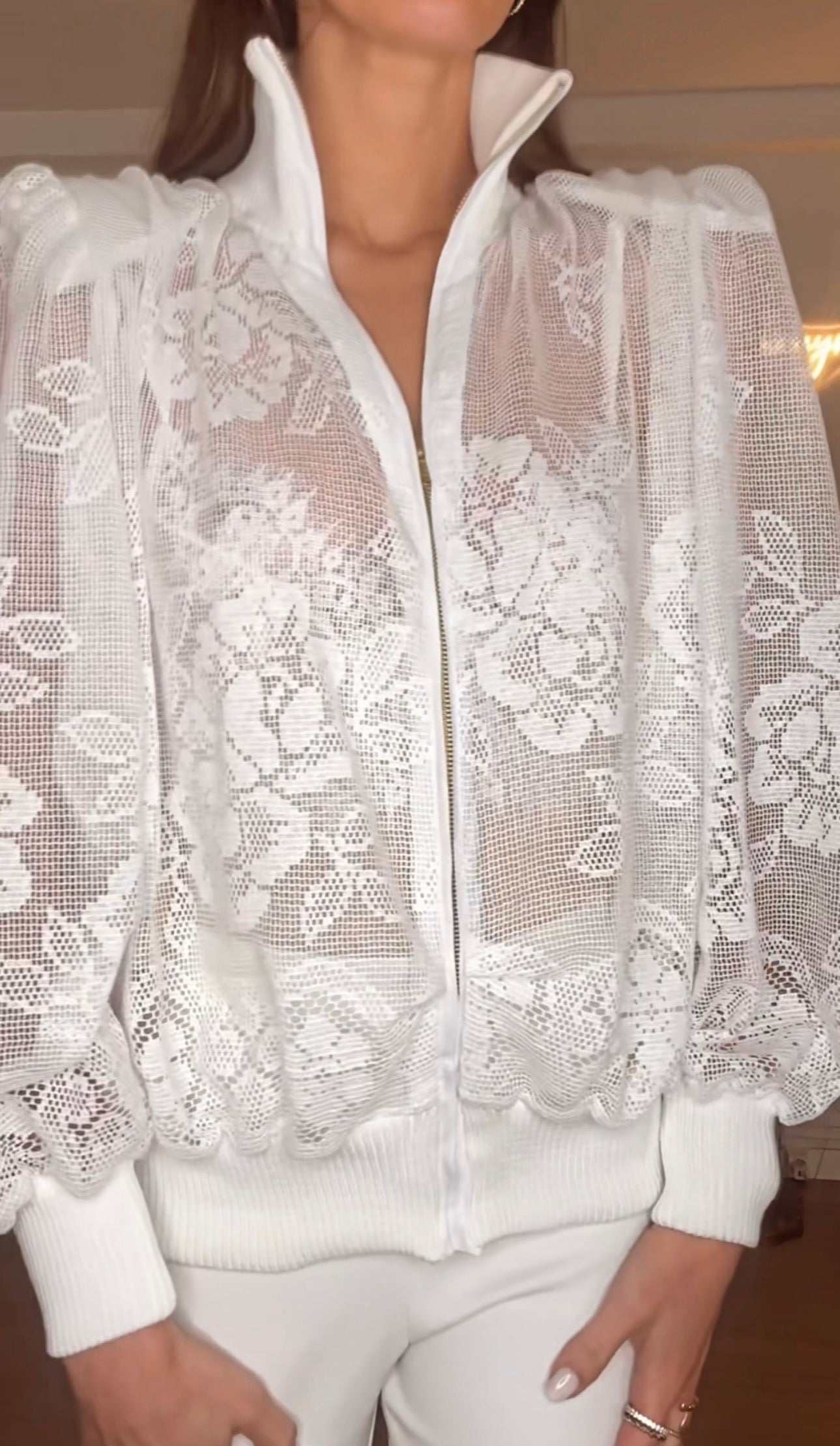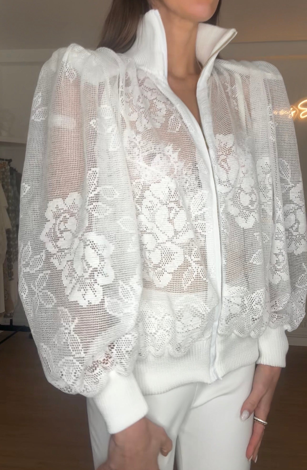 Bomber oversize com gola e punhos com acabamento em malha canelada. Ombreiras forradas incorporadas .