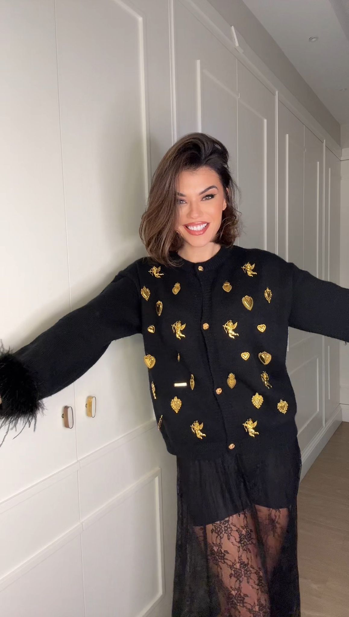 Cardigã de malha costurado 26 medalhas douradas com medalhas de corações barrocos e anjos, costurado todo à mão , aperta em botões dourados .