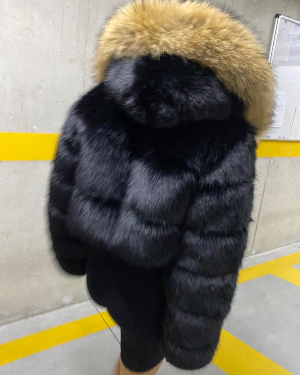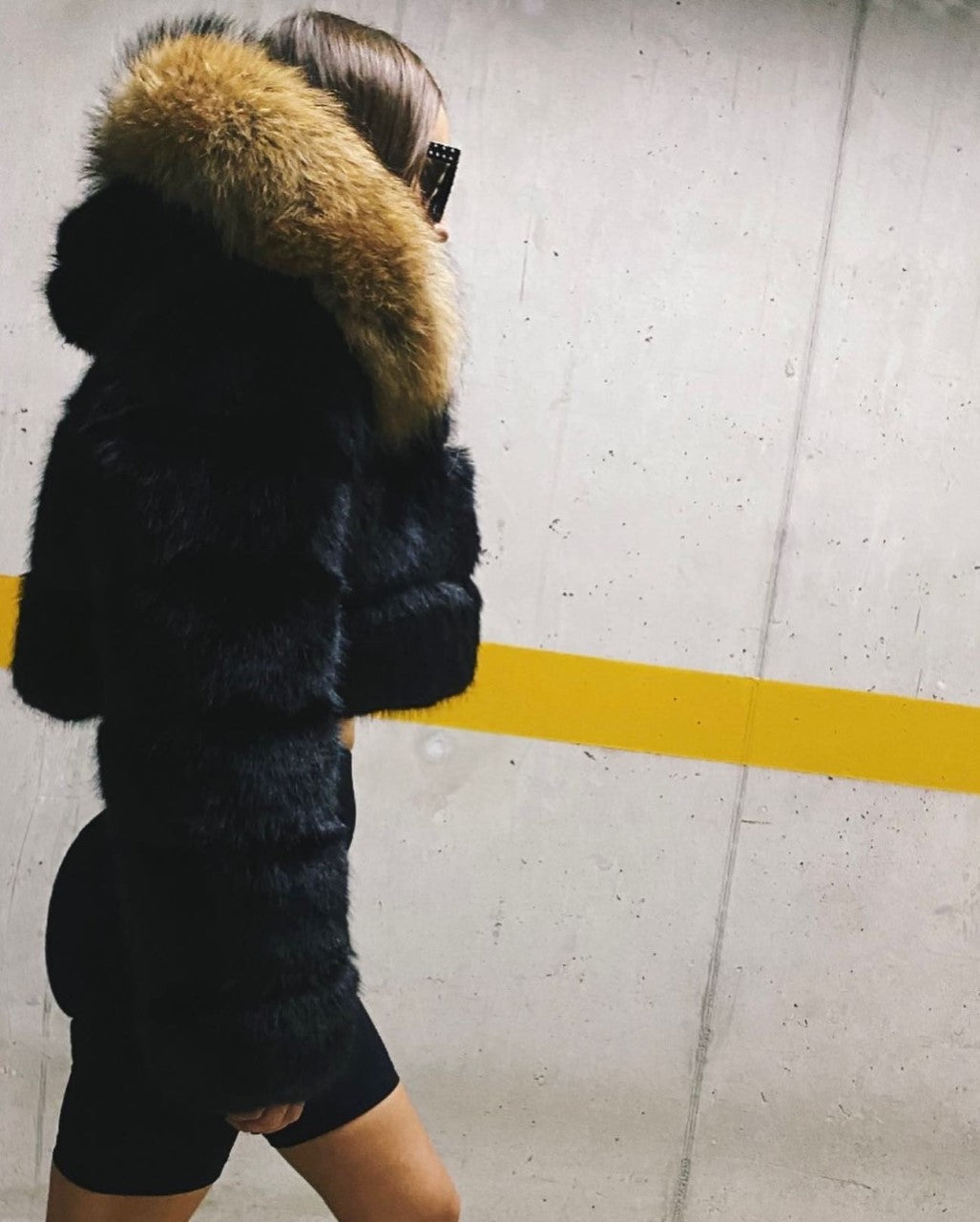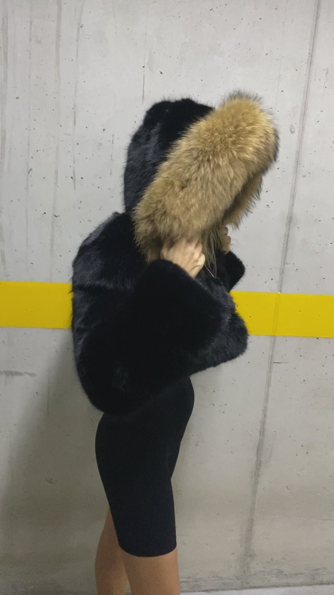 Cor: pêlo preto sintético e capucho em pêlo natural