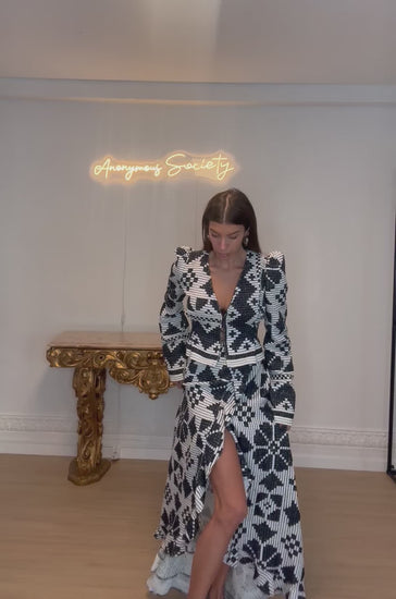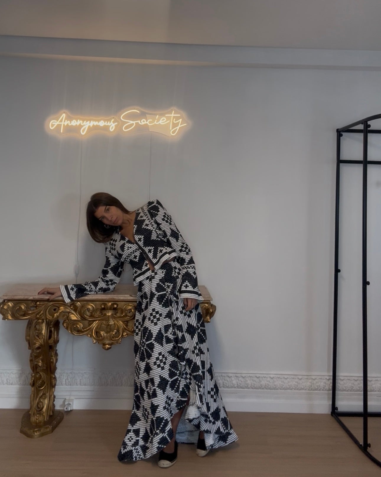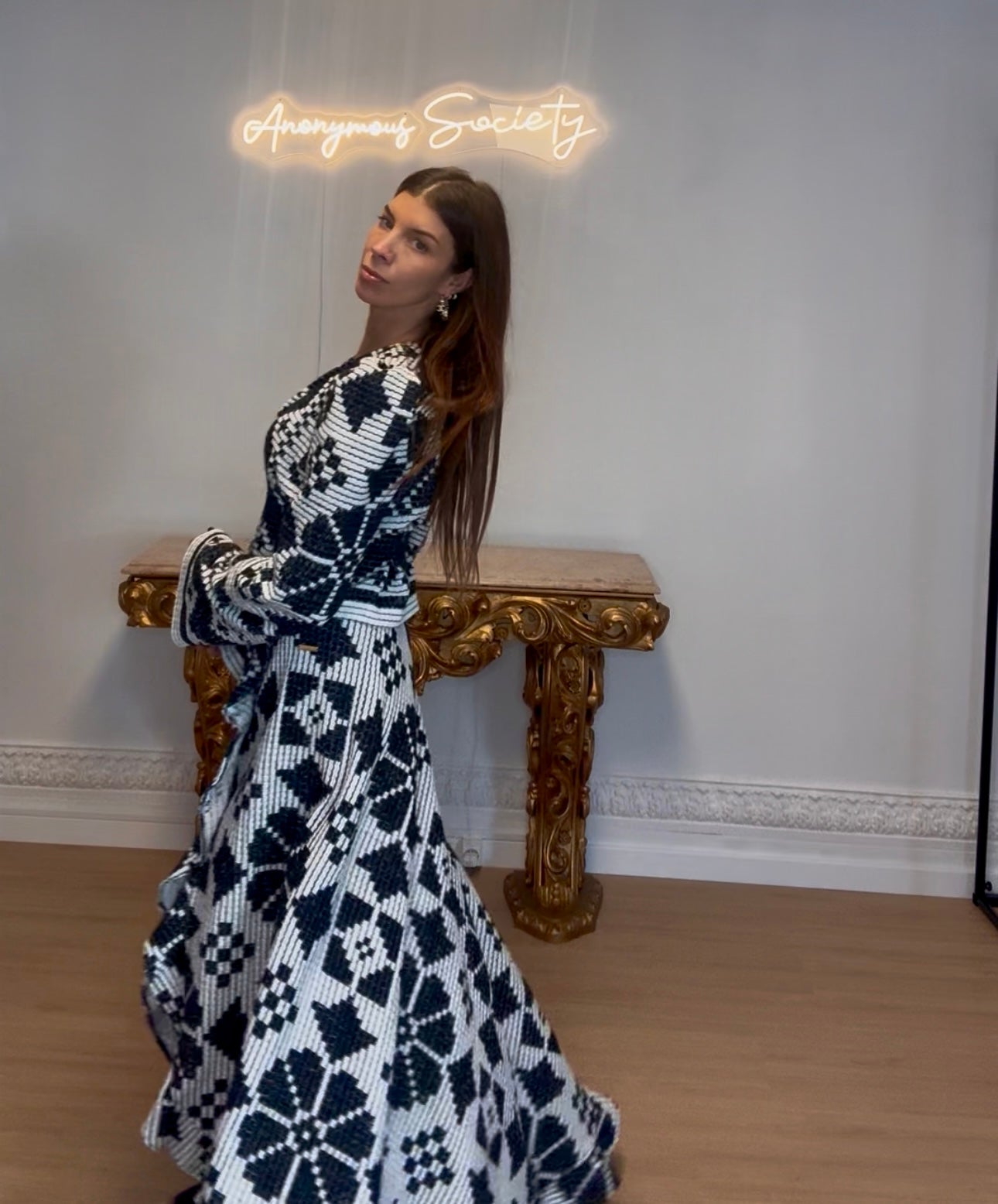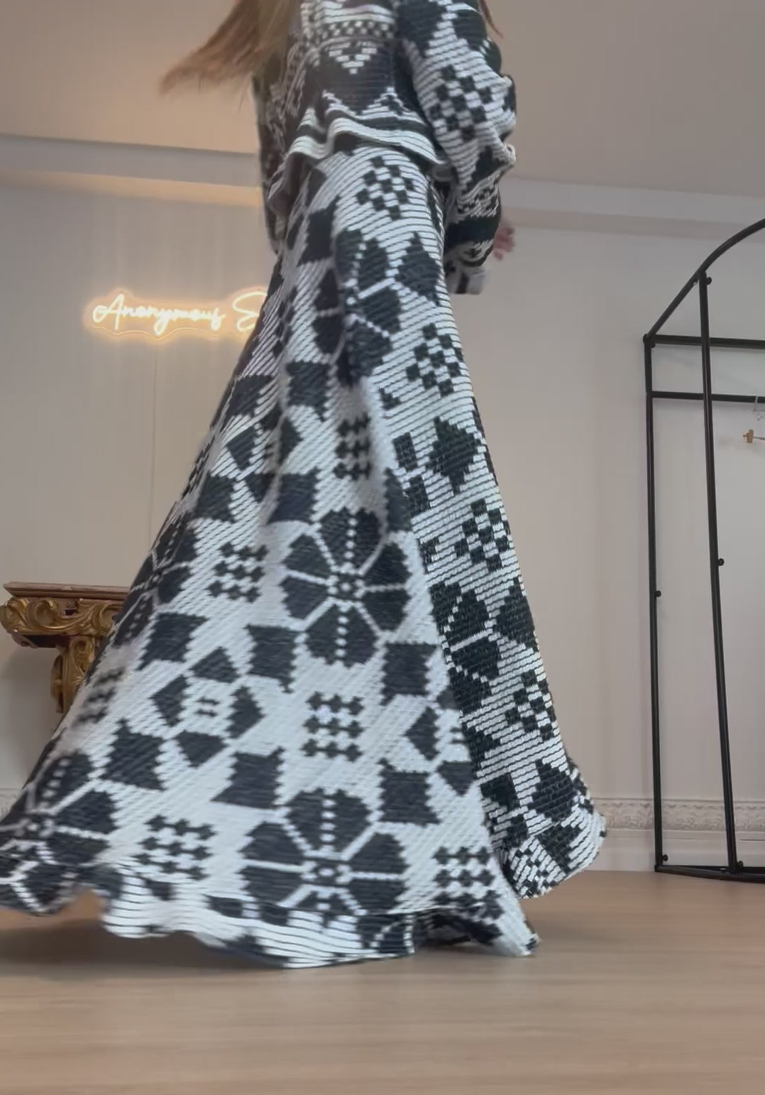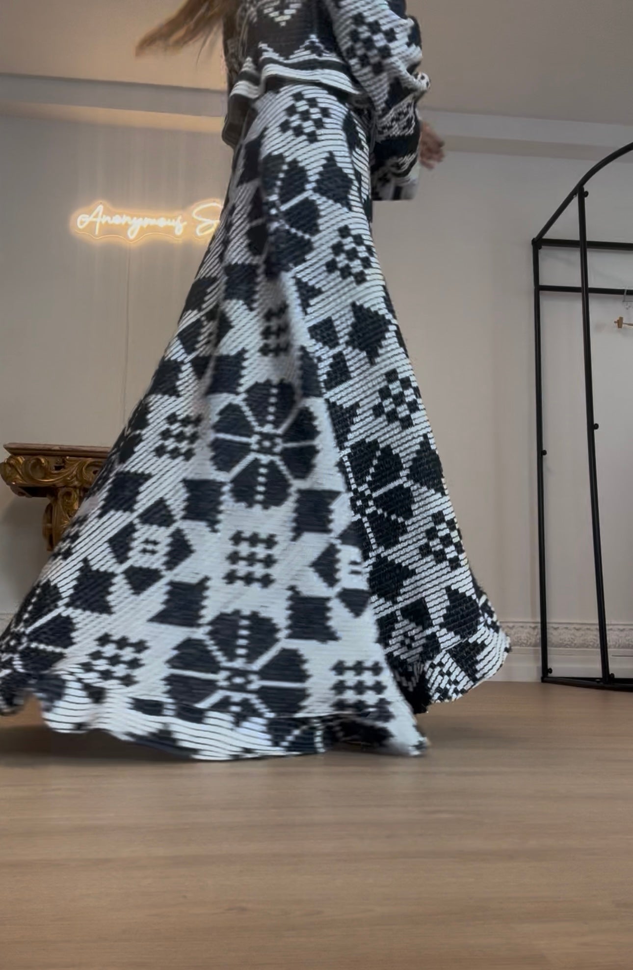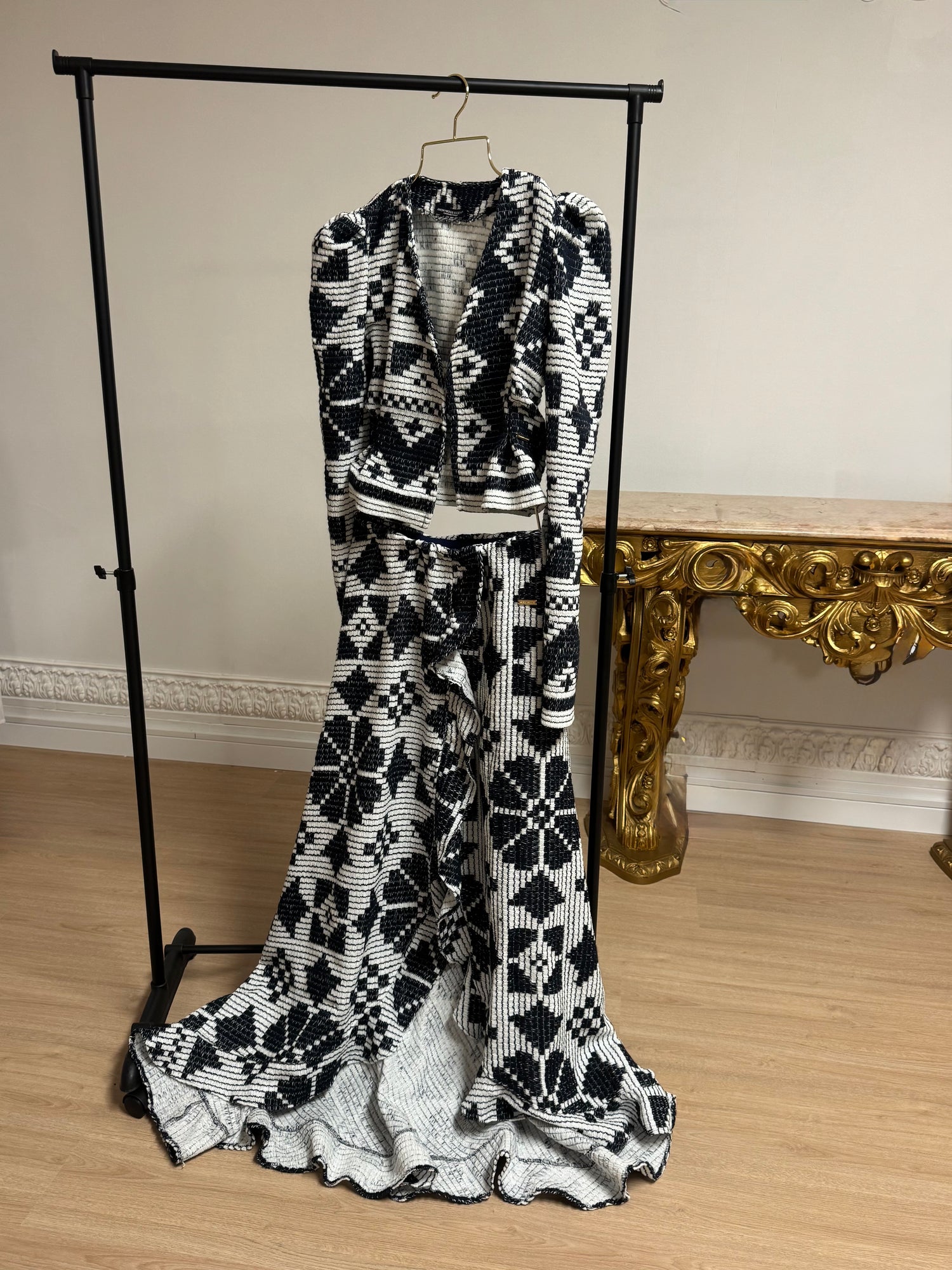 Saia com abertura no centro com folho duplo, cortada em godé, consegue rodar para a posição que deseja a posição do folho, cintura elástica .