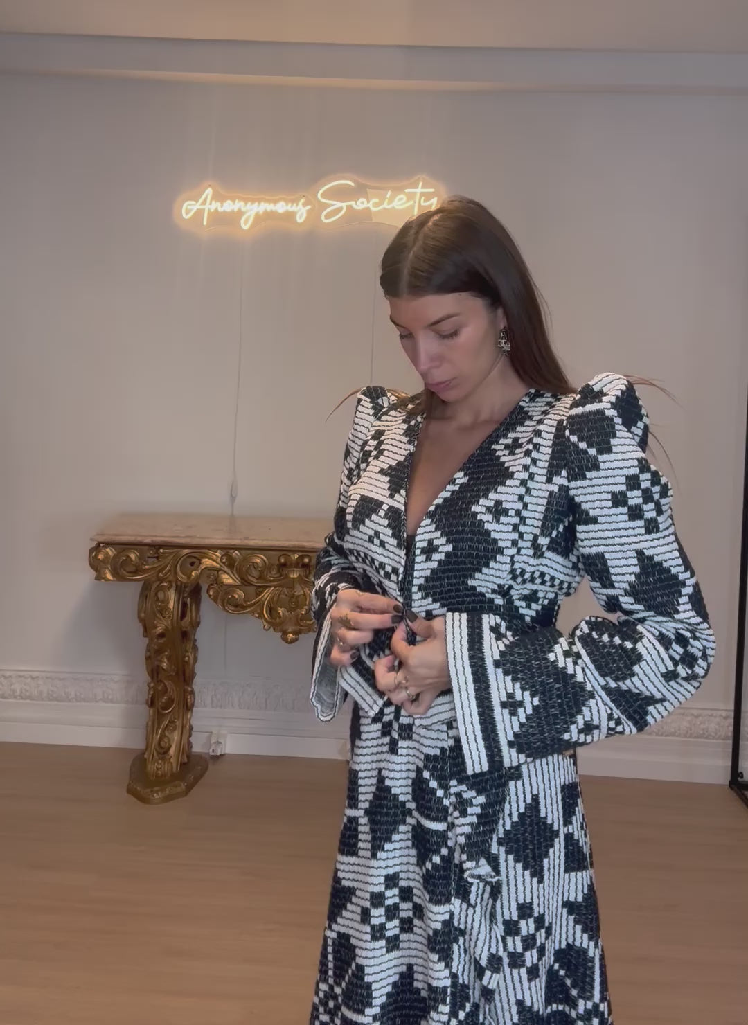 Casaco manga repuxada no ombro em balão , aperta com colchetes .