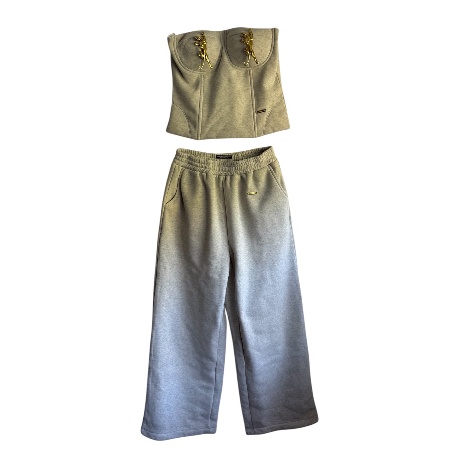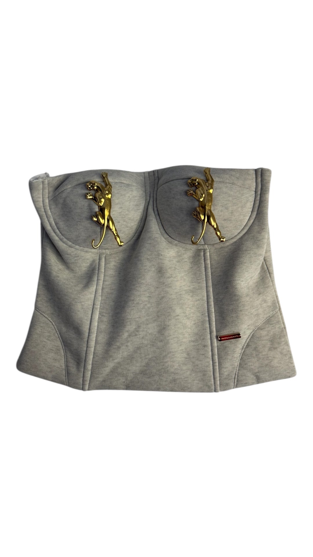Training set composto por um corpete com aplicações de jaguares removíveis e calça larga.