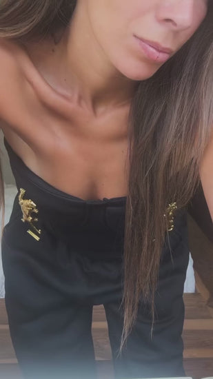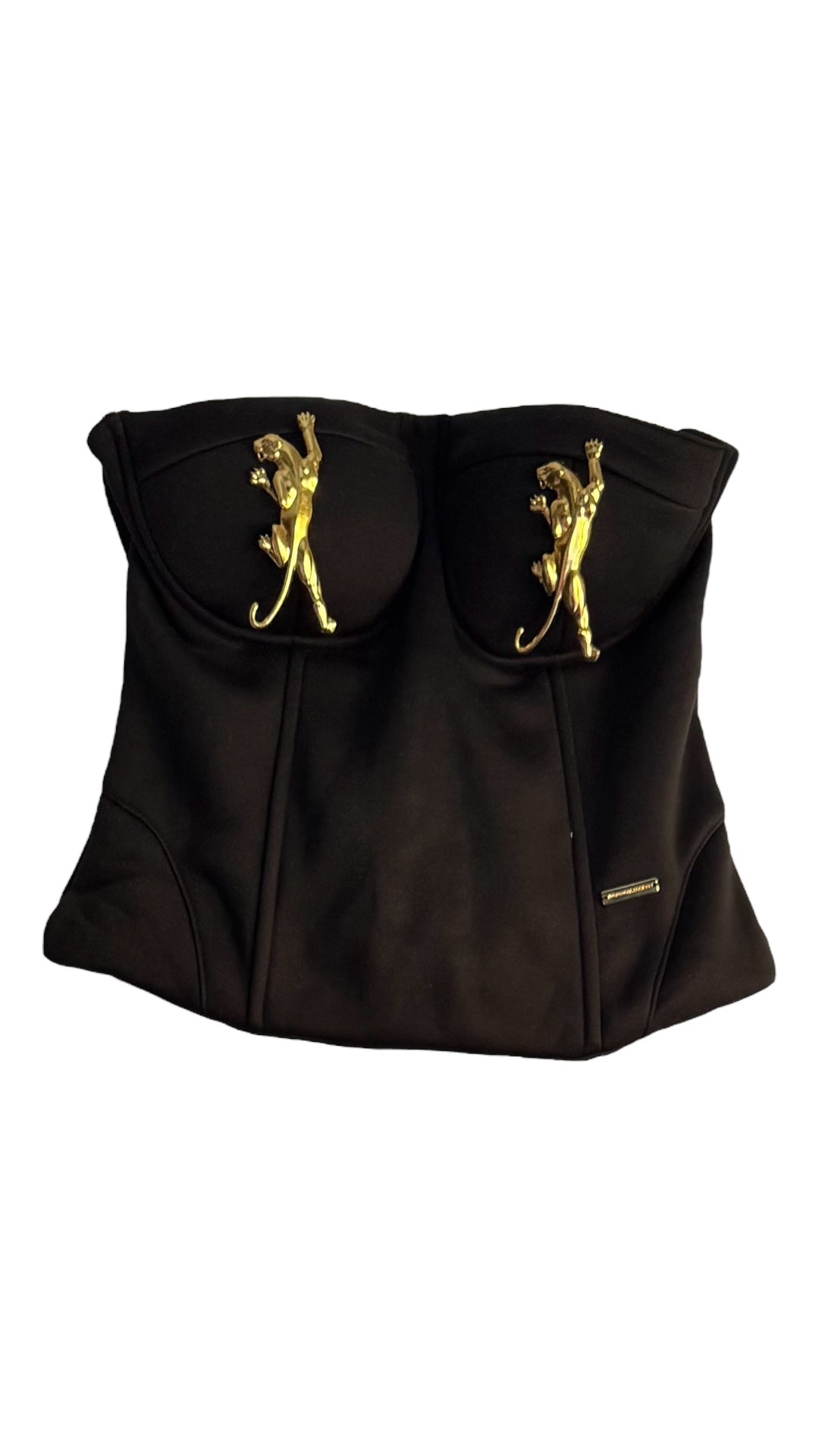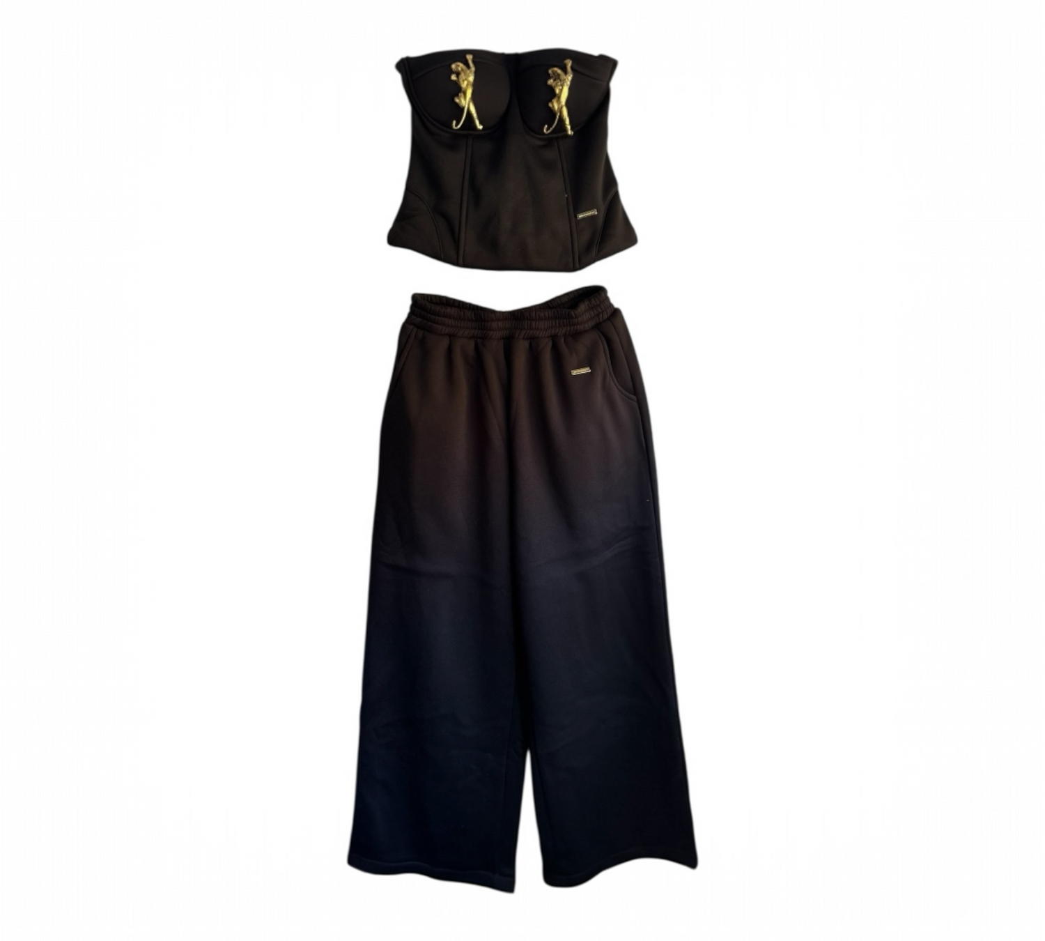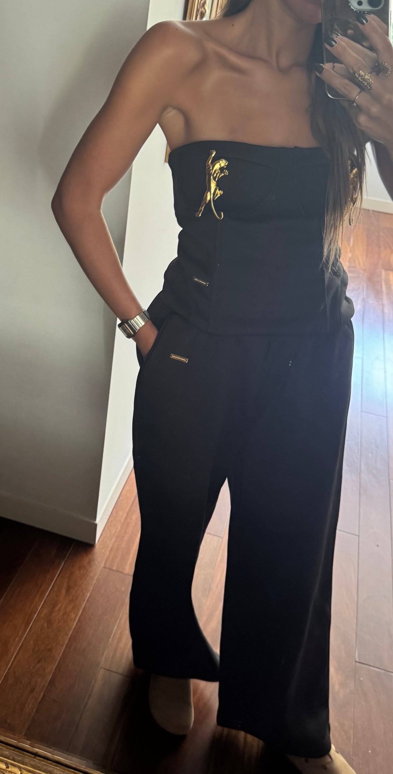 Training set composto por um corpete com aplicações de jaguares removíveis e calça larga.