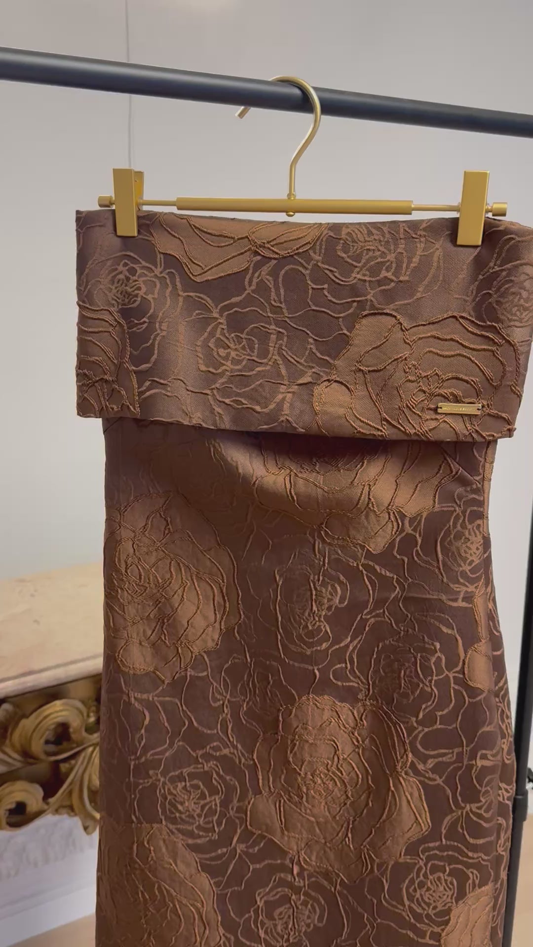 Vestido comprido em tecido brocado ,decote cai cai duplo em corte de barco que realça a elegância dos ombros ,fecho nas costas invisível , racha atrás .