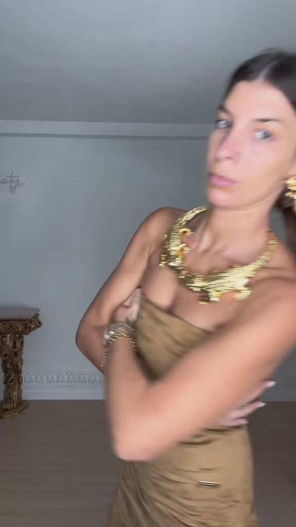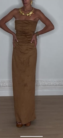 Vestido comprido em tecido pele de pêssego ,decote cai cai duplo em corte de barco ,fecho nas costas invisível .